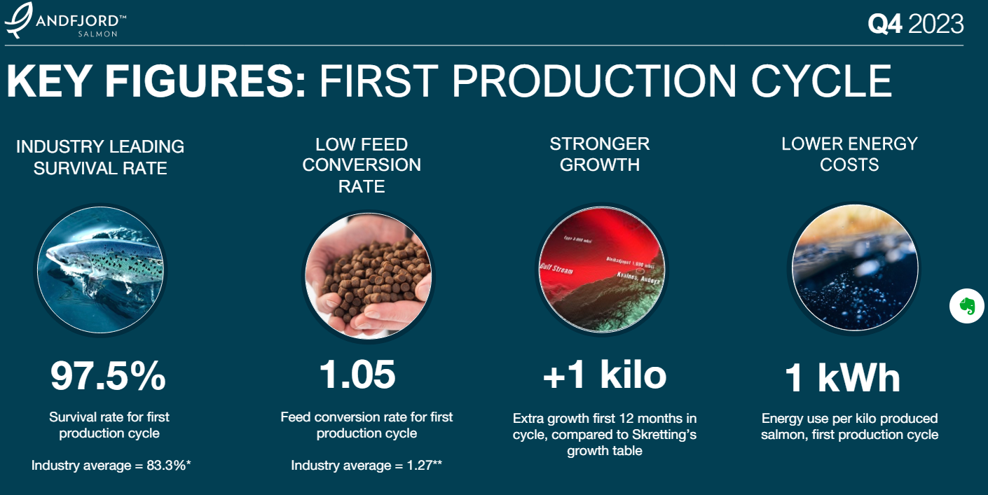 Første slaktesyklus (Q4 2023) viste gode resultater med frisk laks, god fôrutnyttelse og kjapp vekst (i vekt frem til slakt).