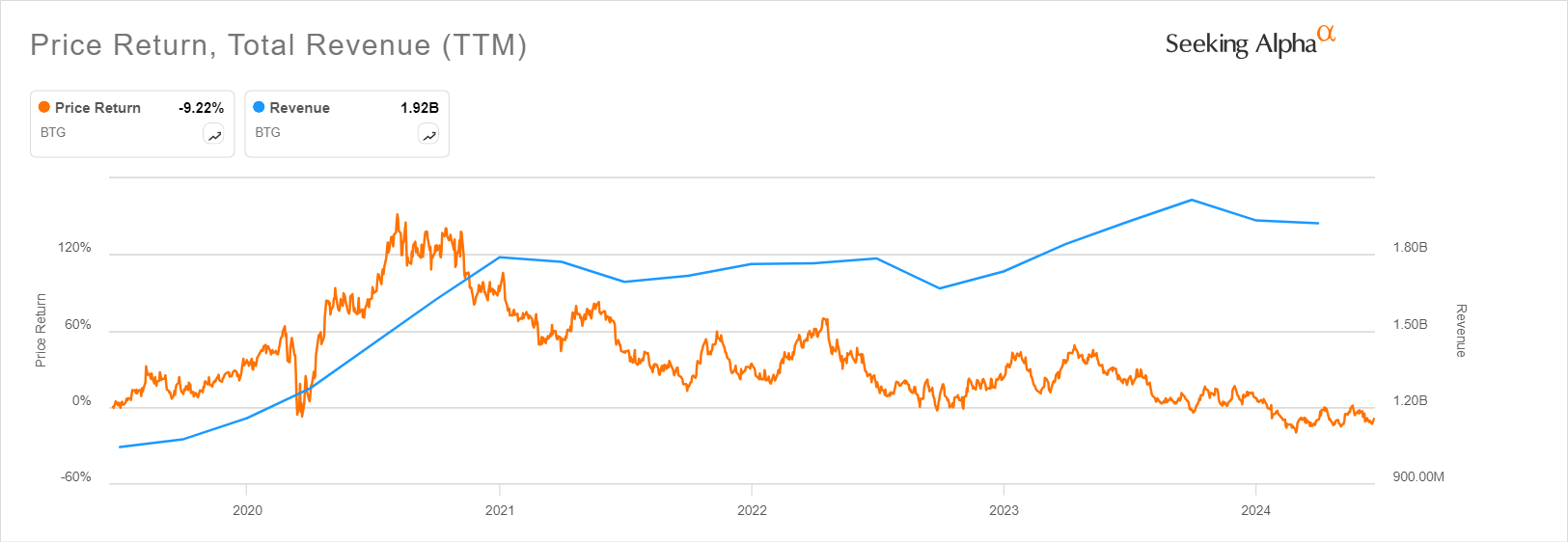 Hvorfor? Fordi siden toppen i november 2020, har aksjekursen falt fra 7 dollar til 2,60. Samtidig har omsetningen skutt i været parallelt med gullprisen: