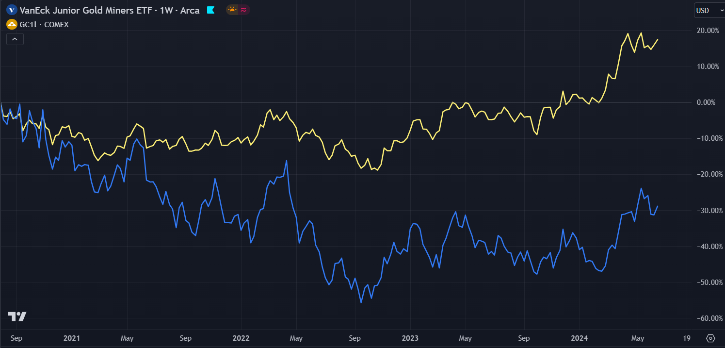 Siden september 2021 har gullprisen (gul) steget med 20 prosent, mens små og mellomstore gruveselskaper (blå) har falt med 30 posent.
