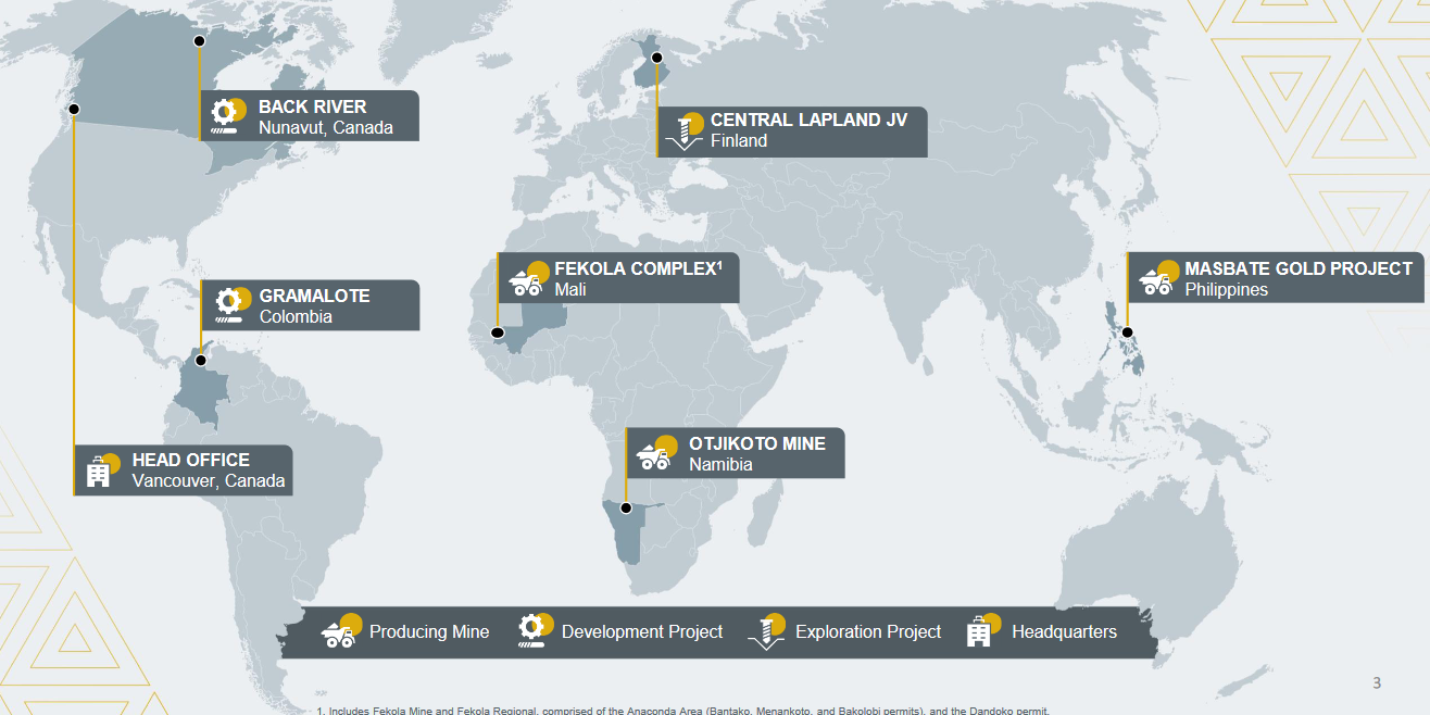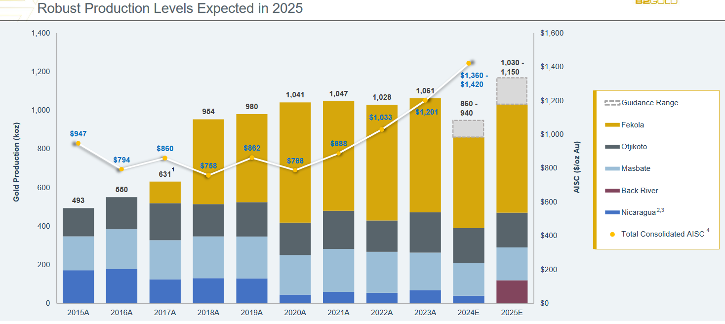 Det kanadiske gullgruveselskapet B2Gold har operasjoner i Afrika, Amerika (både Nord og Sør) og Europa, og produserer omkring en million unser årlig.